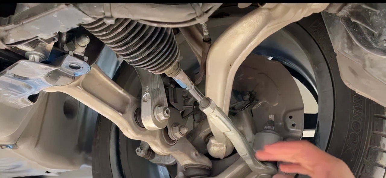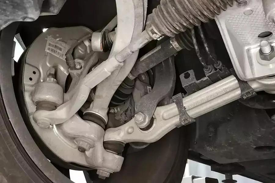 转向节中间镂空,两根连杆上下布置便于安装,也避免了两个螺栓靠的太近造成转向节断裂的现象,转向横拉杆前置与奥迪,宝马一致,但不同于铝合金的连杆,它的转向横拉杆式铸铁材质,做了银色喷涂。