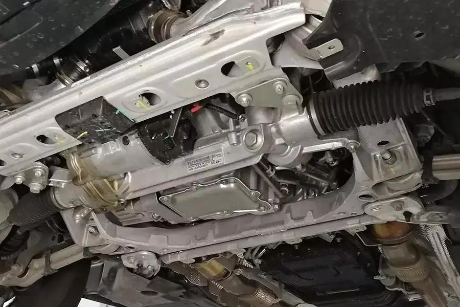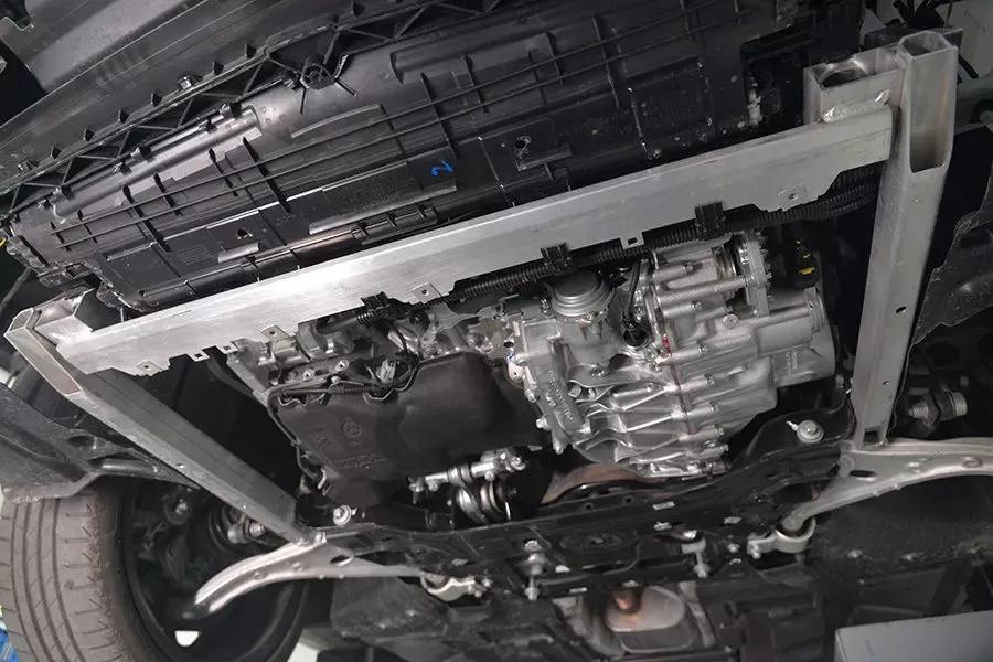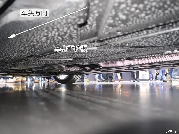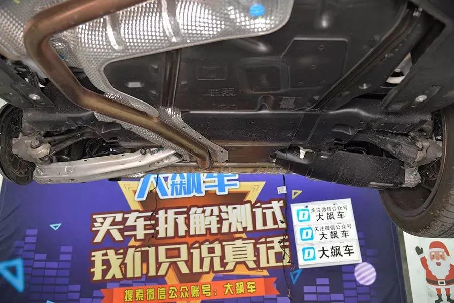 底盘两侧配有非常完整的护板,并设计有导风槽,增强扰流功能。排气管隔热做得十分完整,没有任何遗漏。因为这辆车在海外有四驱版本,所以中央会有预留出很大一块空间,安装传动轴,后排中央地板会有比较高的凸起。尽管国内无缘四驱车型,但还要忍受空间上的不便。