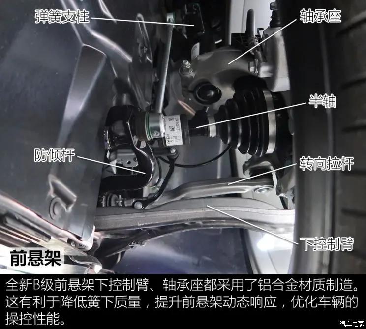 从实拍图中我们可以看到全新B级与上代车型一样,采用的是麦弗逊式前悬架结构。结构简单、占用空间小是此类型悬架的突出特点。由于占用空间小,麦弗逊式前悬架结构被广泛应用于采用横置发动机布局的车型之上。