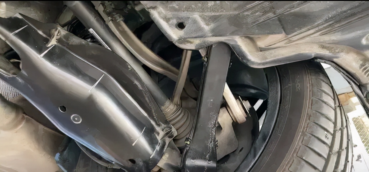 车底的铝箔板隔热层覆盖得非常到位,从车头到车尾,覆盖面积很大。在车底有不少铝合金材质的车身加强杆,起到稳固车身以及增加车身刚性的作用。