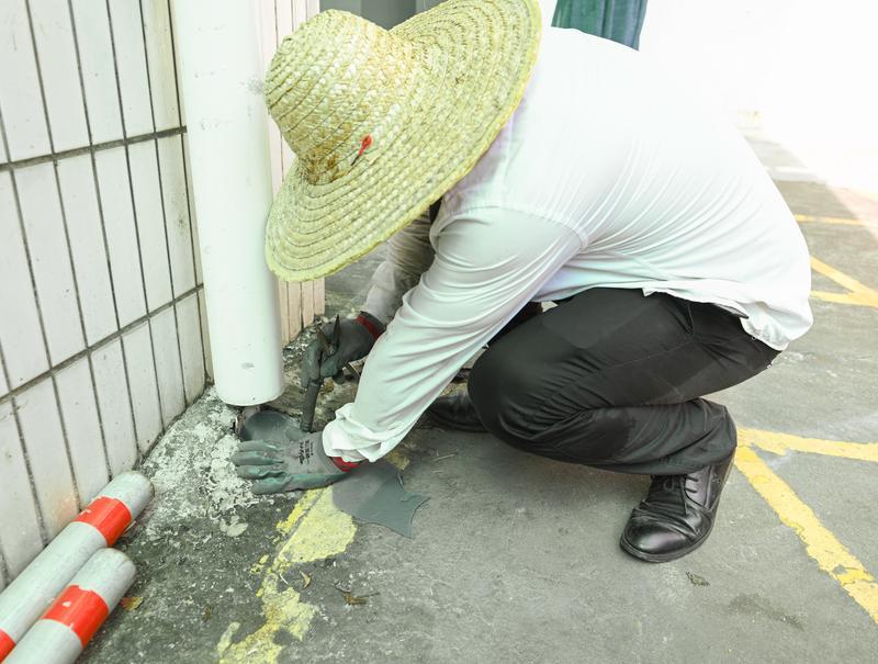7月25日,工作人员在广州中医药大学顺德医院为下水道加装防虫网。新华社记者 肖恩楠 摄