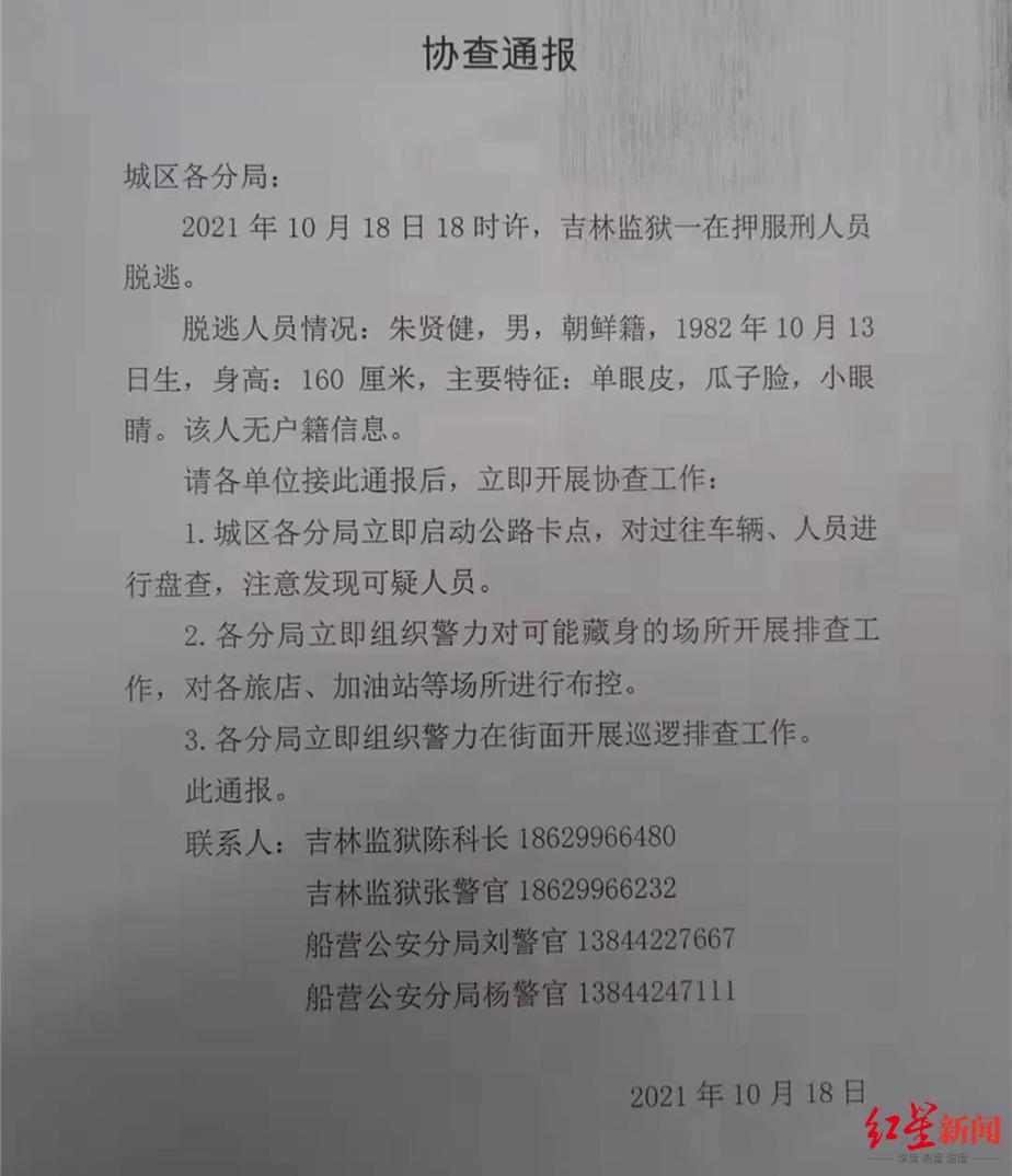 10月18日晚,一份“协查通报”在网上流传。据通报显示,10月18日18时许,吉林监狱罪犯朱贤健利用收工时间,强行进行脱逃。请各单位接此通报后,立即开展协查工作。