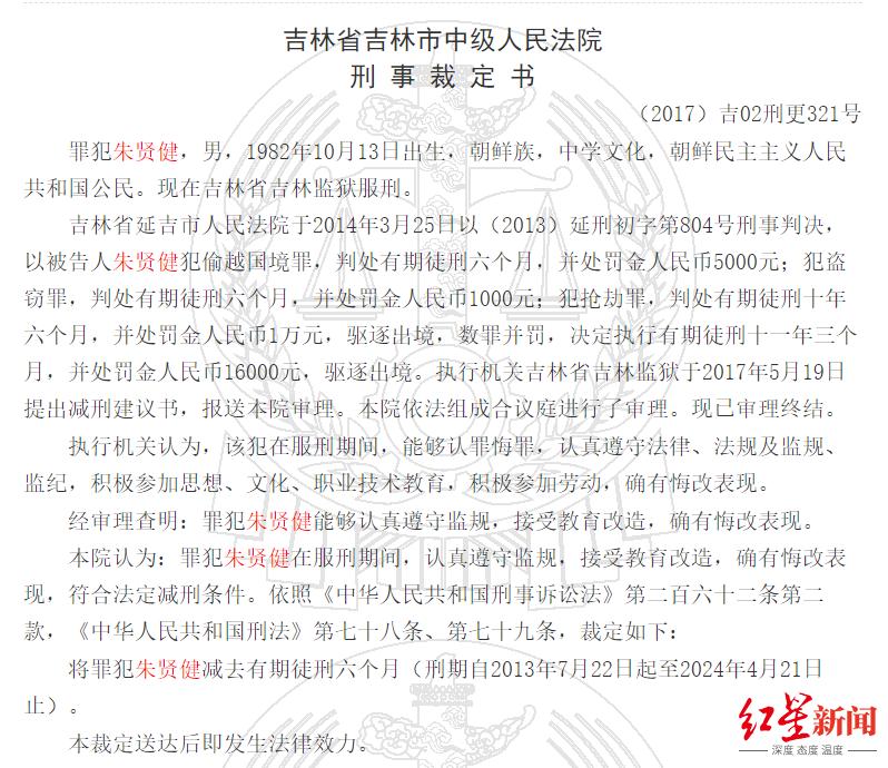 另据两份刑事裁定书显示,朱贤健在2017年和2020年曾两次获得减刑。其中,在2017年,执行机关吉林省吉林监狱认为朱贤健在服刑期间,能够认罪悔罪,认真遵守法律、法规及监规、监纪,积极参加思想、文化、职业技术教育,积极参加劳动,确有悔改表现,遂提出减刑建议书,报送吉林省吉林市中级人民法院审理。