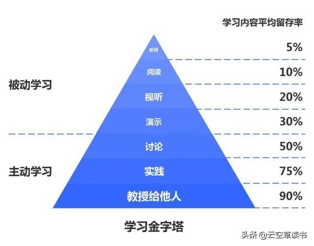 其中在学习的金字塔里可见,“教授给他人”是主动学习层面效率最高的部分,学习留存率可以达到90%。所以提高学习力的方法就是化被动学习为主动学习,以教授为目的,发心学习,必能达到良好的效果。