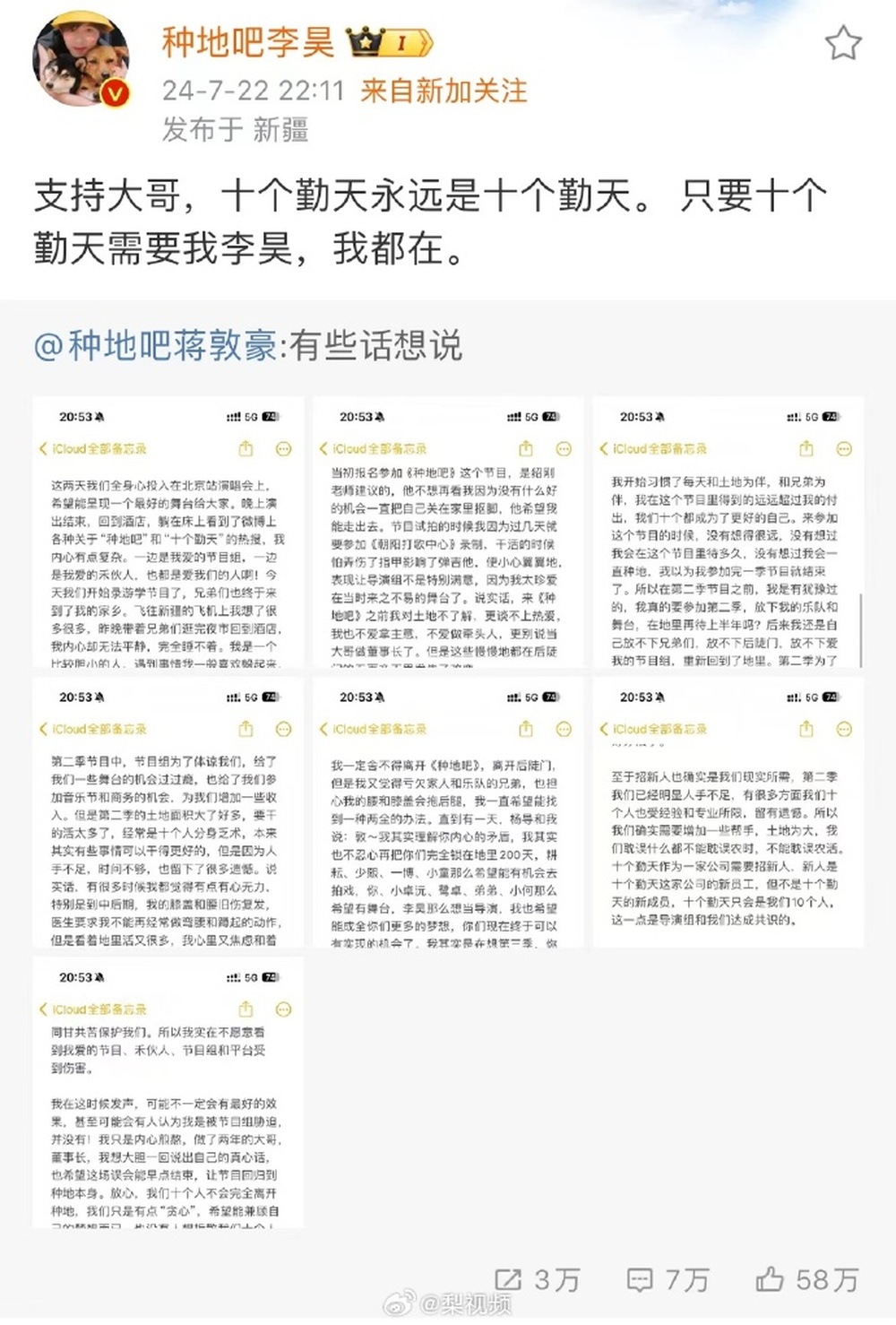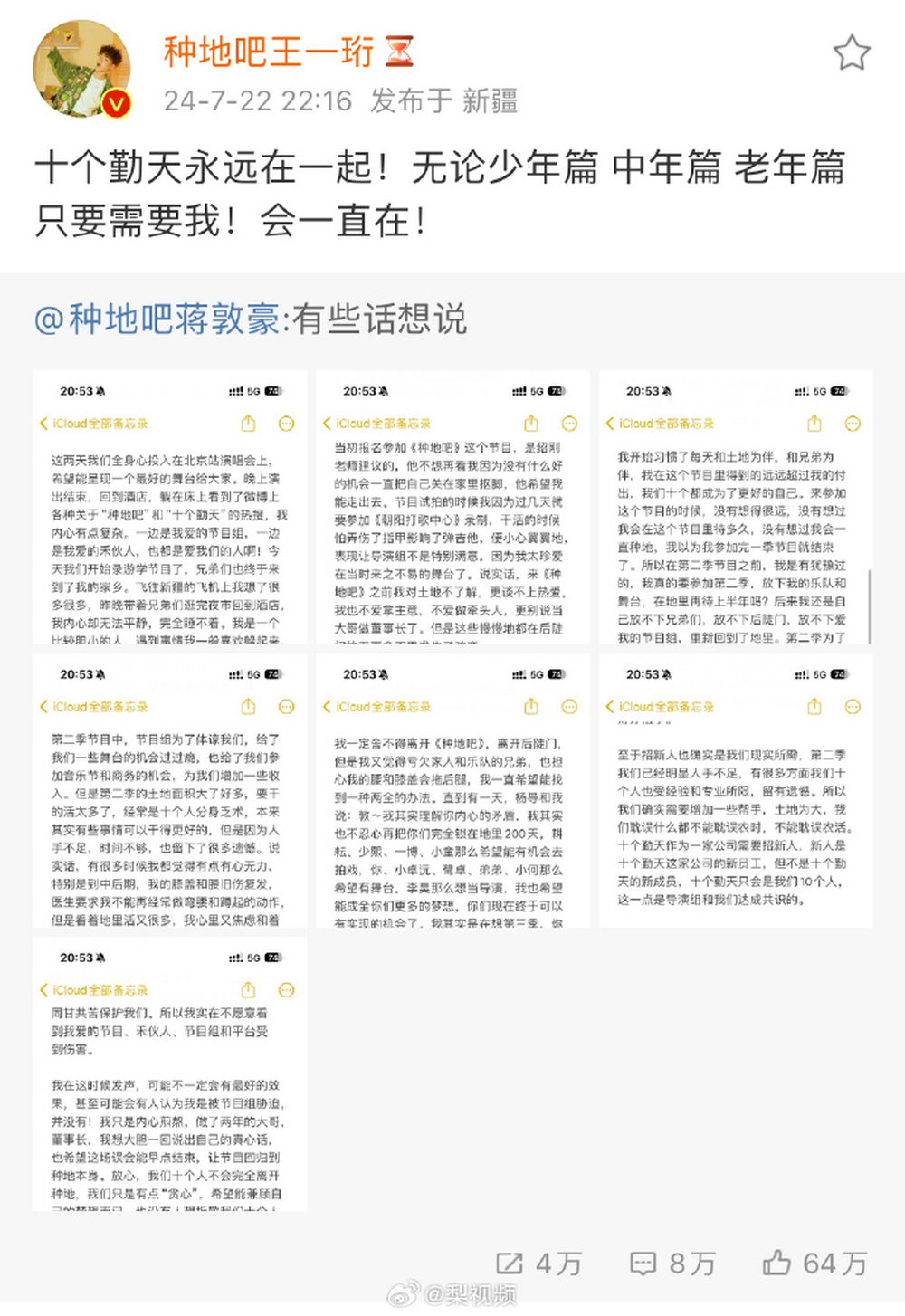 《种地吧》蒋敦豪发长文回应加人争议:“十个勤天只会是我们10个人”!导演深夜致歉,节目官博掉粉已超80万
