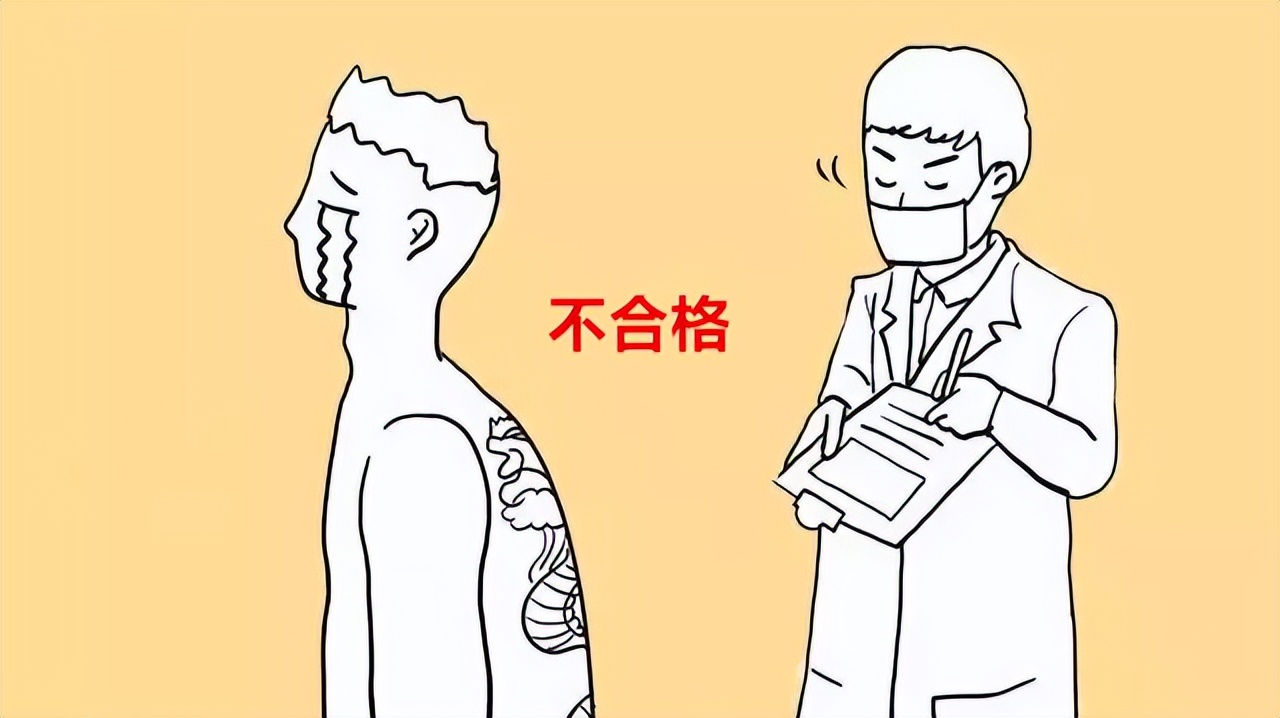 面颈部文身,着军队制式体能训练服其他裸露部位长径超过3cm的文身,其他部位长径超过10cm的文身,男性文眉、文眼线、文唇,女性文唇,不合格。