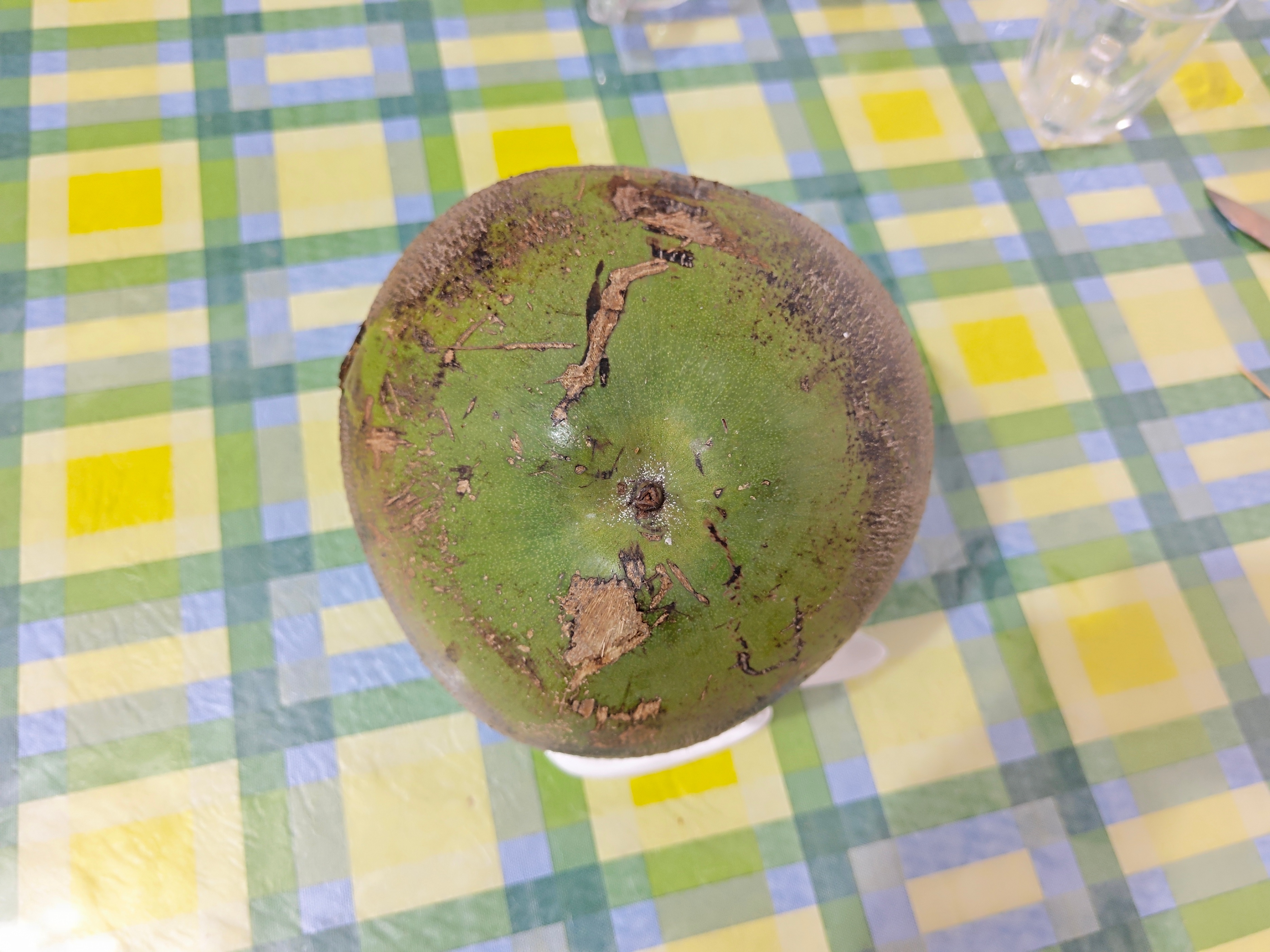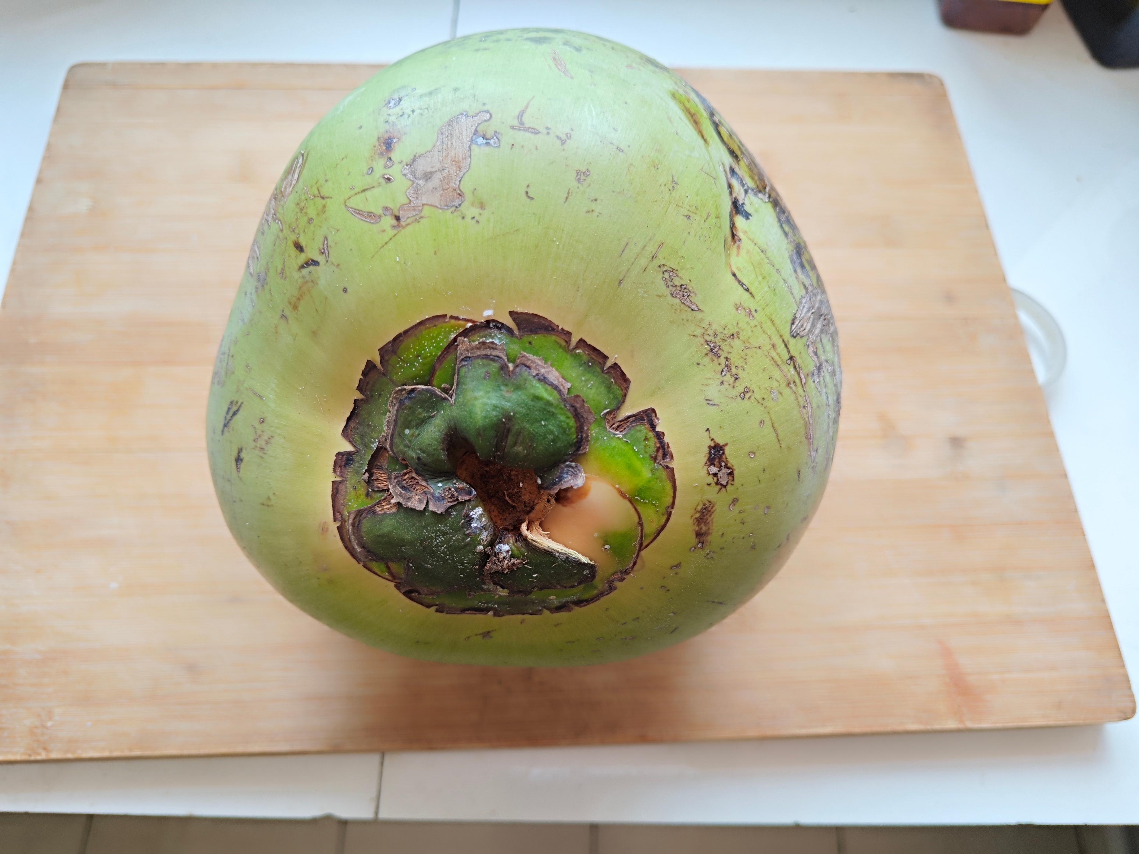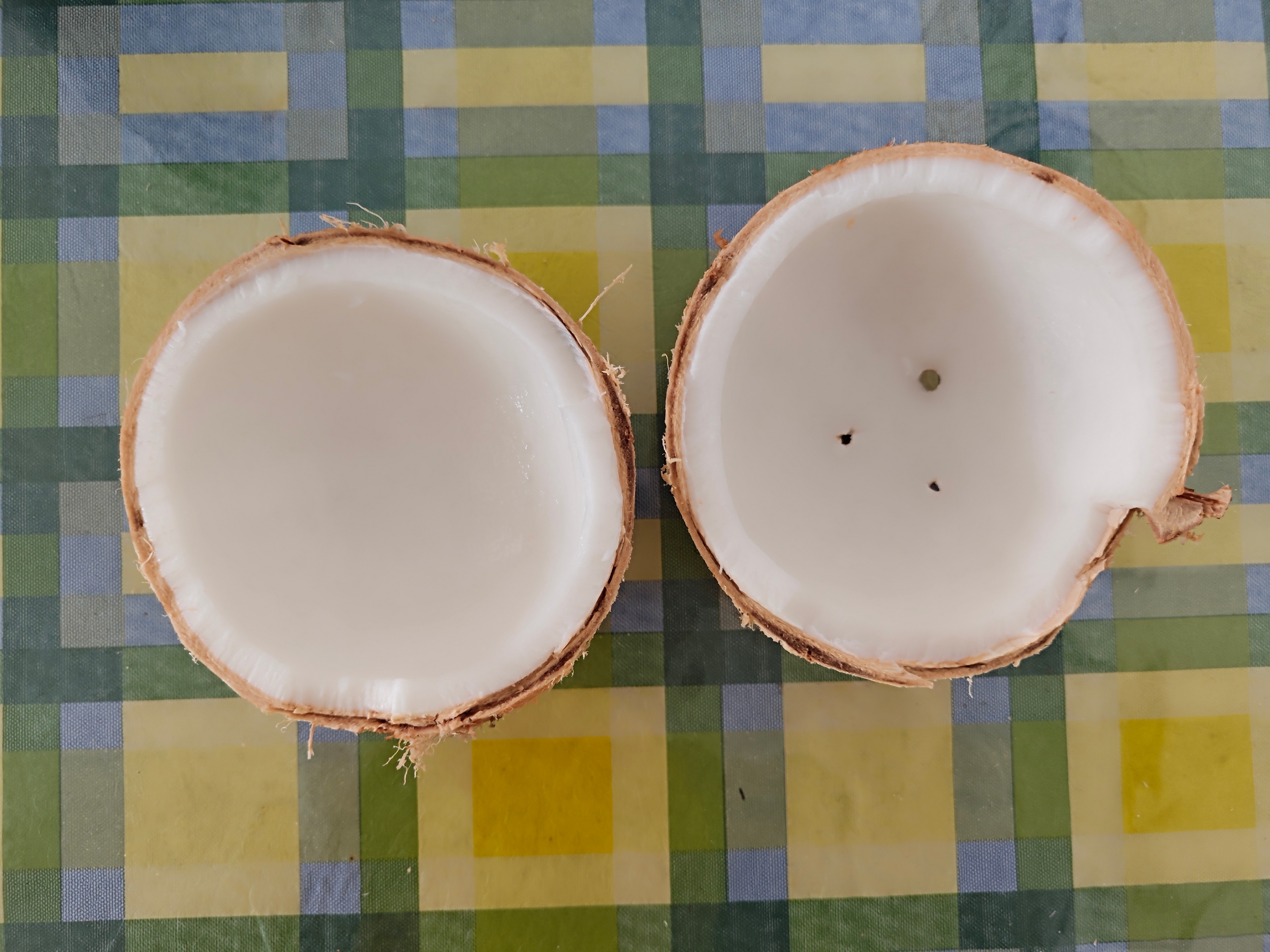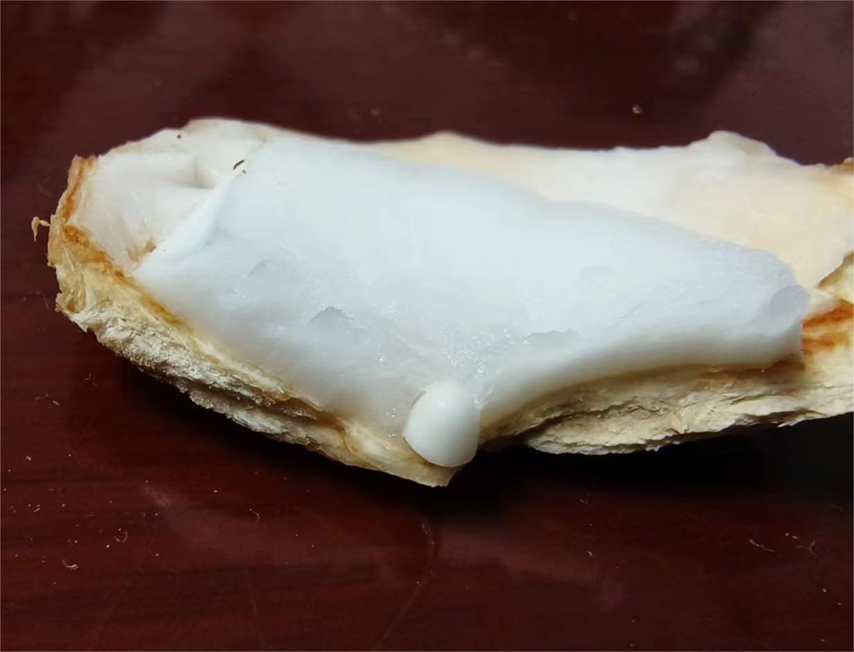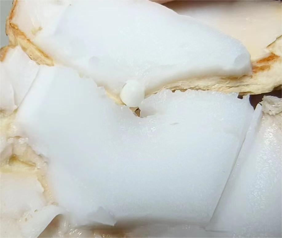 之后,我又给老父亲和老母亲买了一个,让他们也尝尝(多年前也给他们买过,好像当时也没有吃椰肉)。但是过了一个多月后,他们仍然没有吃,于是我便给他们打开了。谁知这个椰子的椰肉只有薄薄的一层,呈透明的凝胶状,用勺子一刮就下来了。我还直埋怨老父亲不及时吃,椰肉都被水解了。哈哈,真是浅薄了,直到今天我才知道,这不是水解了,而是椰子太青了,椰肉的质地是随着椰子的熟化,从半透明的胶状转变为雪白脆质的固体,最后又逐渐变薄变黄。