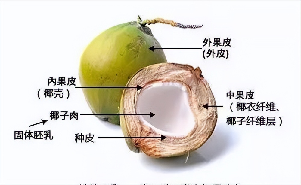 一个椰子就是一个硕大的核果,应该也是最大的核果,它由外果皮、中果皮、内果皮、种皮、椰肉(固体胚乳)、椰子水(液体胚乳)、胚组成。