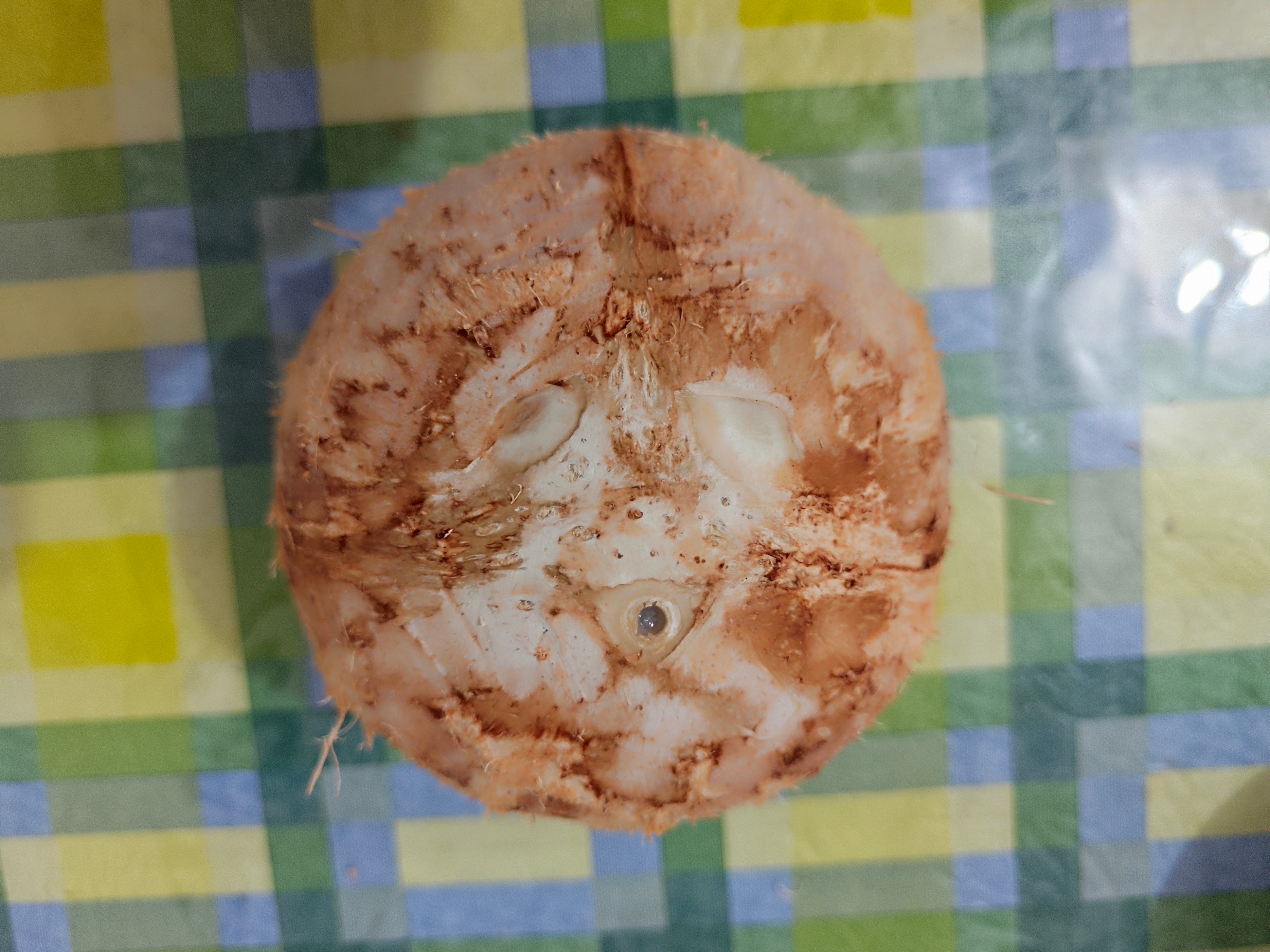 有些人将椰子划为坚果,但我觉得它应该是核果,我们只要闭上眼睛,对比一下它与桃杏李的结构就明白了。下面我们将它从外到内细细解剖一下。