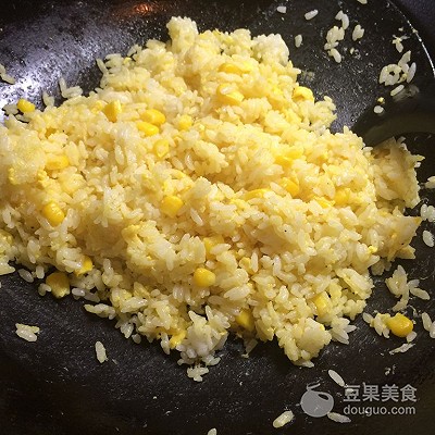3、锅里倒入玉米油,温热后倒入米饭炒散。加入玉米粒和鸡蛋液(蛋液内先加入2克盐和胡椒粉打散),炒至蛋液收干,盛起备用。