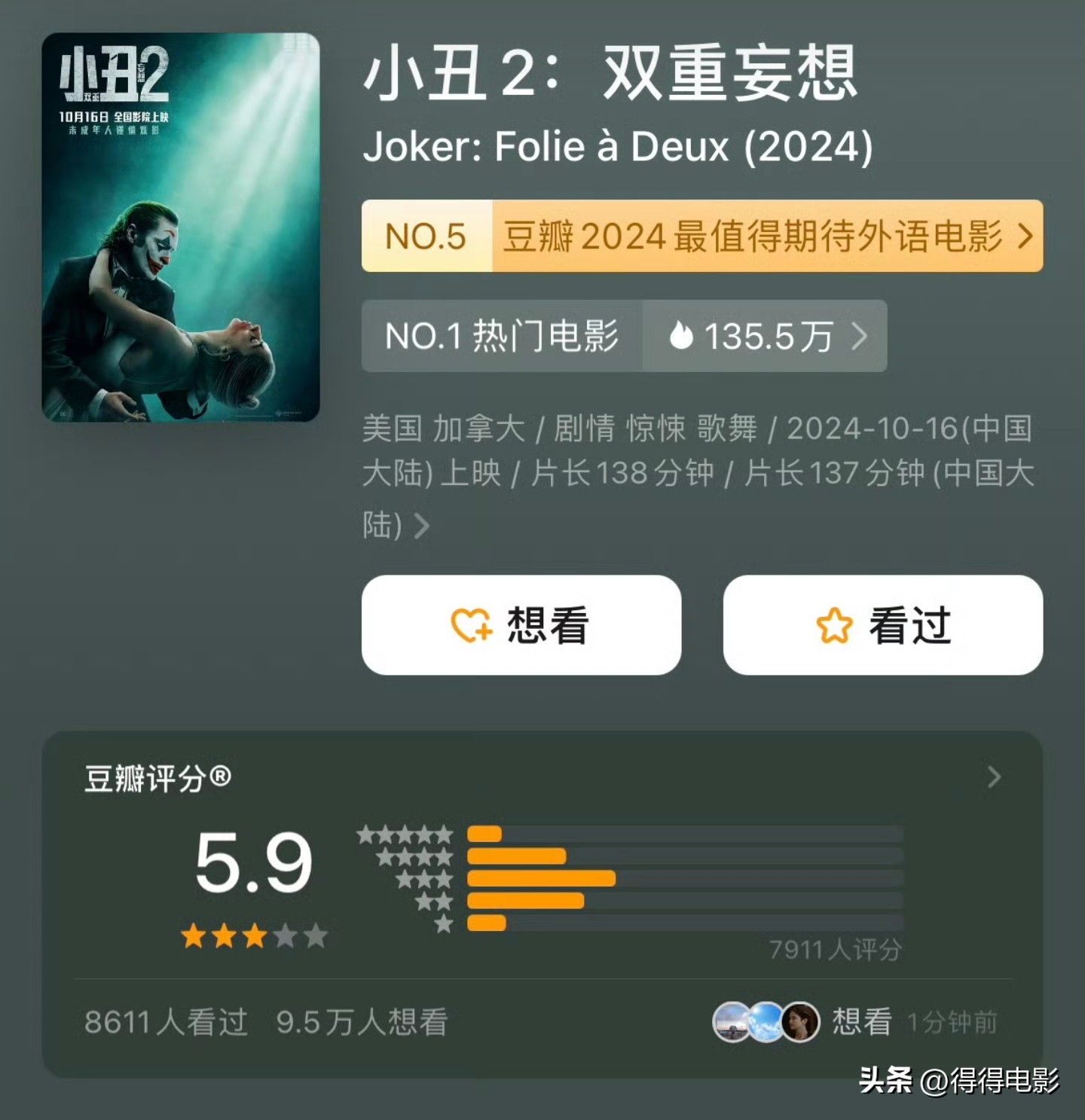 而这部《小丑2》依然是原班人马出演,还有Lady gaga加盟,成本一举提高到了2亿美元,可以说是进行了全方位的升级,从中成本变成了S级大制作。