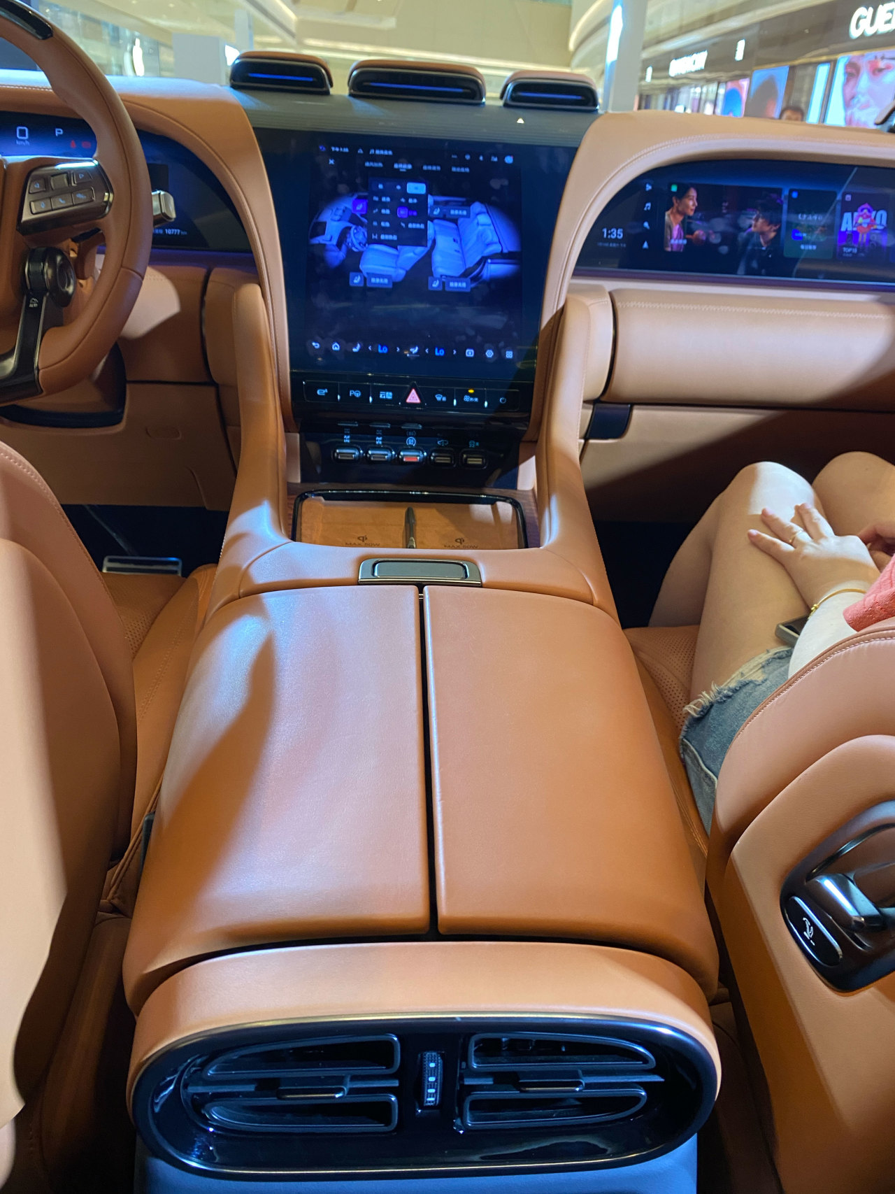 冰箱的开启方式,是在前排扶手处上下开启,因为扶手是两瓣对开,所以不能像方程豹那样把冰箱盖板与扶手盖板合二为一,扶手盖板打开后,还有单独的内盖板,冰箱容积略小。另外在Console后端没有找到能打开冰箱的门。