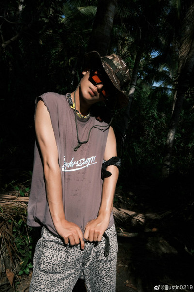 黄明昊夏日丛林氛围感写真来袭,渔夫帽搭配脏辫和墨镜帅气有型,豹纹长裤更是增添了一丝野性,网友看到直呼:“ Justin在世界尽头也是帅的,脏辫发型炫酷无比,有丛林冒险少年那味儿了。 ”“文案里的“逃到世界尽头”也太浪漫了吧~是给粉丝们的521告白吗?”
