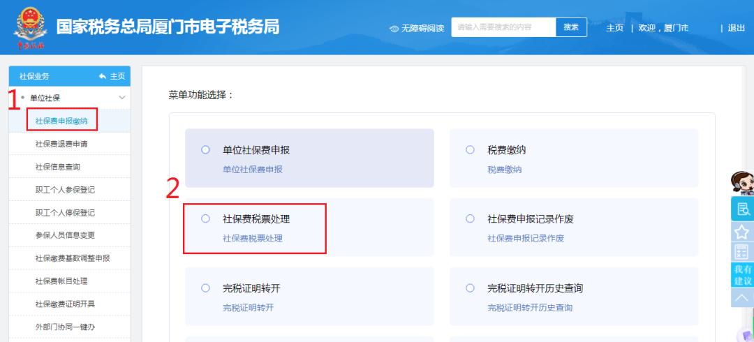 返回主界面后,首先,点击电子税务局首页左侧【社保业务】-【单位社保】,选择【社保费申报缴纳】。其次,点击页面中的“社保费税票处理”。