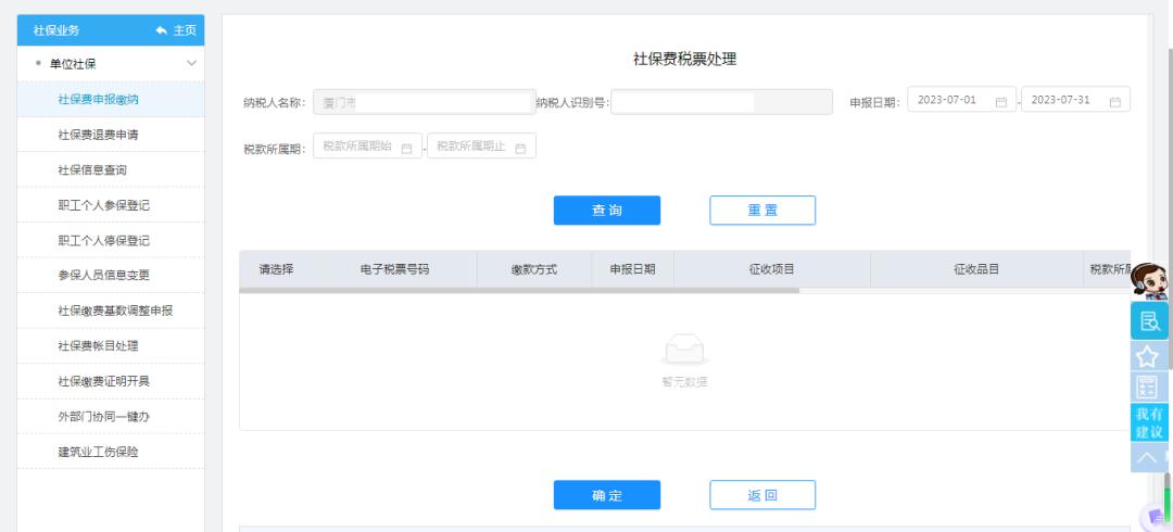 【社保税费票处理】界面无“征收项目”,即成功作废税票,可重新选择方式扣款。