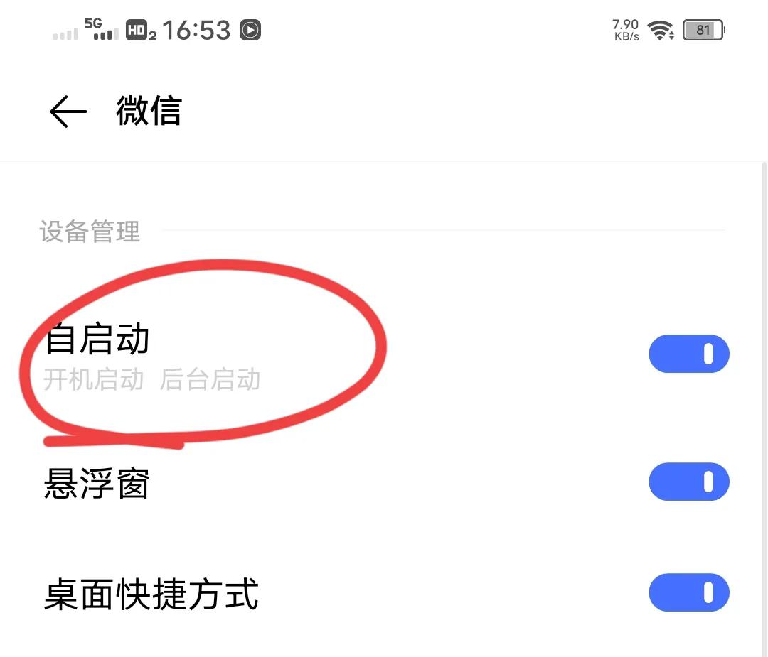 自启动按钮一定要打开,如果不打开后台无法运行,别人发来消息自然就看不到。(如上图所示)