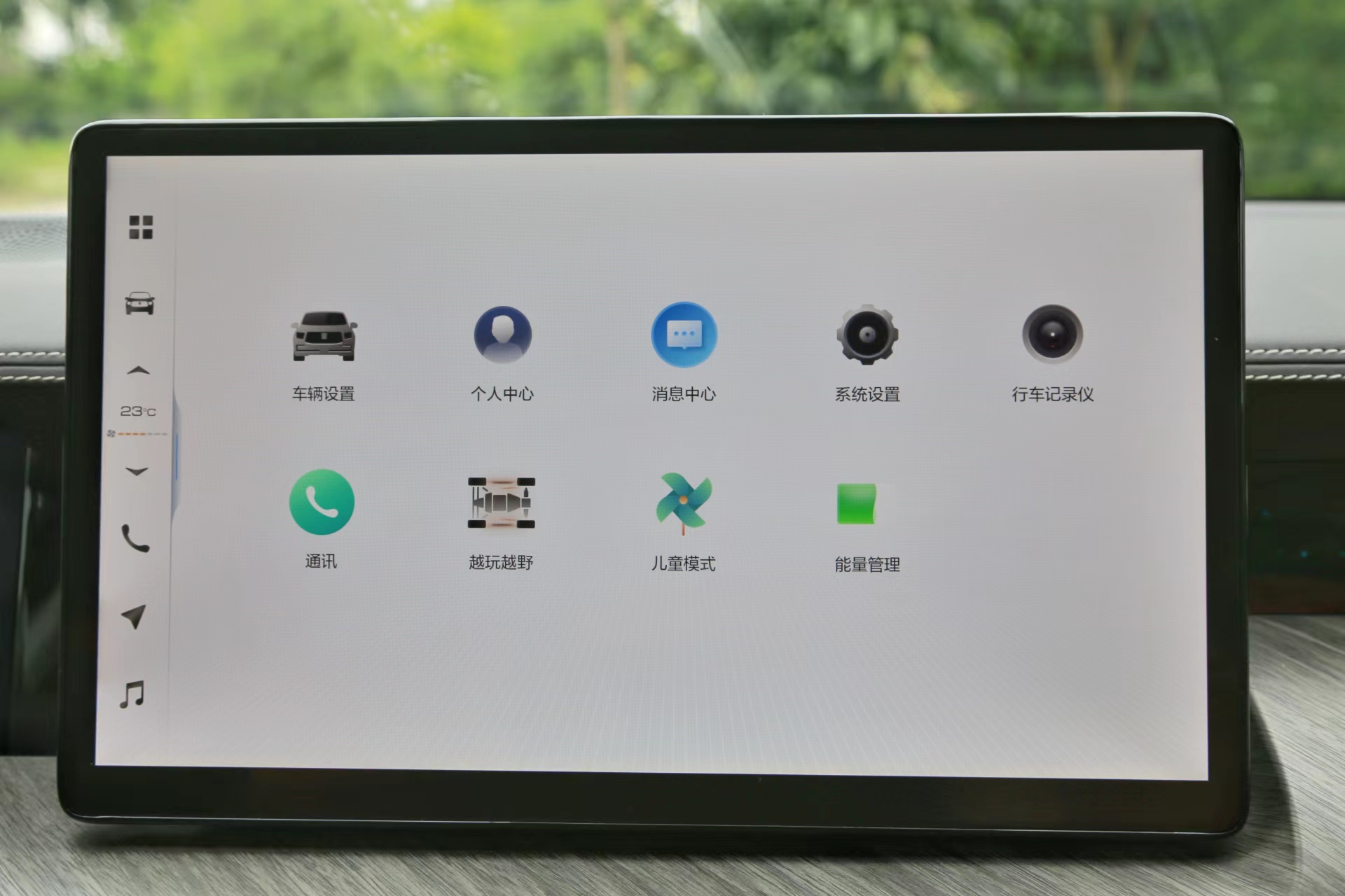 中控采用14.6英寸媒体触控屏幕,边框极窄,同时对反光抑制到位,可读性高。内部UI界面简洁,图标很大,易上手。屏幕最左侧为空调,泊车影像,驾驶模式的快捷操作键,使用起来很方便。
