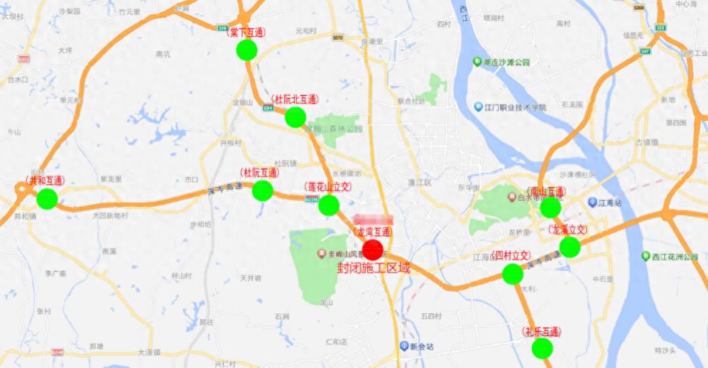 交通管制措施:对深岑高速公路(G2518)江门段(江鹤高速公路)龙湾收费站及经龙湾收费站出入匝道实施封闭交通管制,禁止车辆通行。