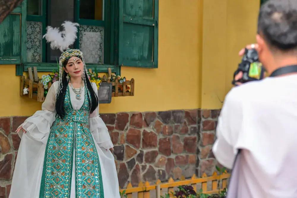 在新疆伊犁哈萨克自治州伊宁市六星街,游客体验旅拍项目。新华社记者 丁磊 摄