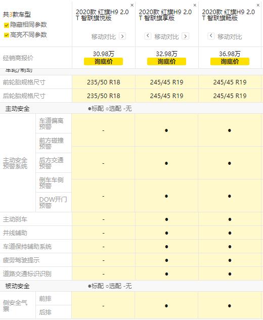 红旗H9在本月内已经正式上市,价格和配置都正式公布,30.98万-53.98万。不得不说,真香!H9拥有着豪华车所有的要素,豪华品牌、纵置发动机布局、铝合金多连杆悬挂。根本不是像雷克萨斯ES那样的横置前驱铸铁麦弗逊悬挂的伪豪车比得了的。相信有不少小伙伴对H9早就心动了,都在观望等降价吧。那么,在这段时间里,不妨看看我对H9配置的分析,也希望我的分析能帮助大家买到最适合自己的配置。像H9的外观、内饰、尺寸我就不废话了,之前已经介绍过无数次,今天我们就直奔主题,直接对比各个车型的配置,最后再得出结论。