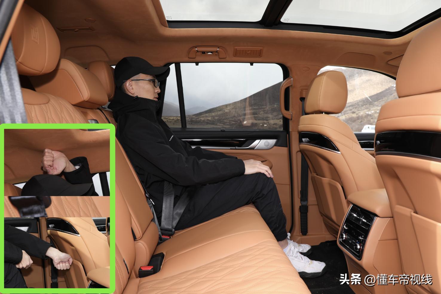 空间体验方面,坦克500算得上中大型SUV里空间表现不错的。体验者身高175厘米,坐在前排调整到合适坐姿,头部距离车顶还有一拳两指。保持前排座椅不动,后排腿部和头部空间分别有两拳以上和一拳左右,再加上带遮阳帘的全尺寸天窗和纯平状态的第二排地板,整体视野和空间感都不错。值得一提的是,新款坦克500座椅对于腿部和腰部的承托性也较好。