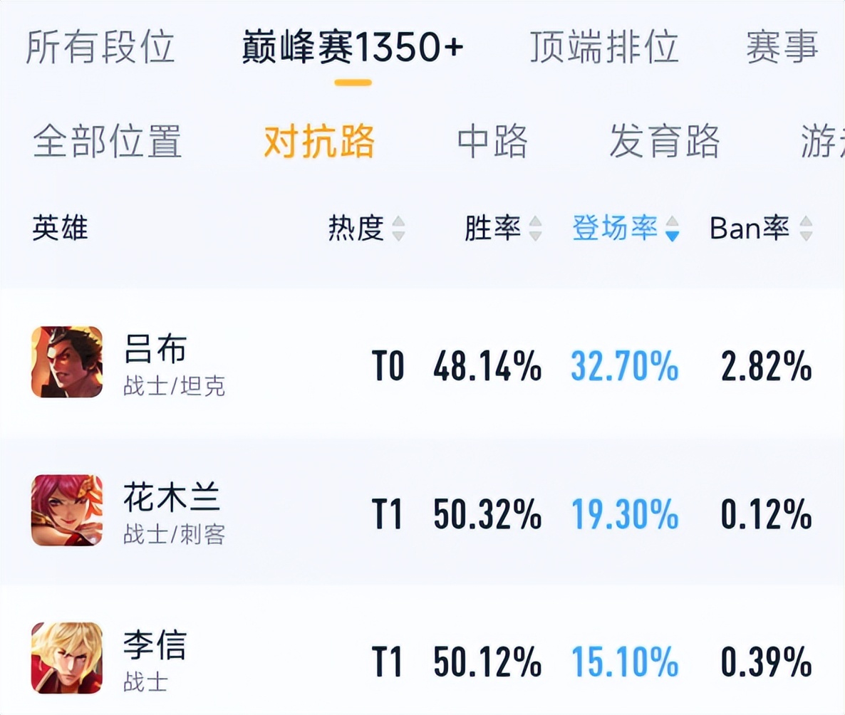来看一下目前巅峰赛1350分以上对抗路的登场率,排名第一的是吕布,第二的是花木兰,而第三就是李信了。