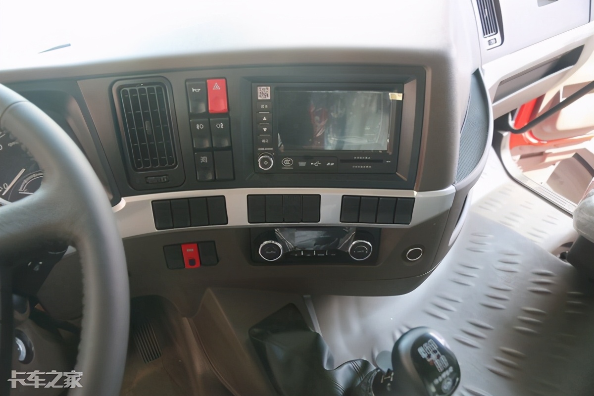 仪表盘的设计依旧传统,指针式仪表搭配电子屏的设定也比较简洁,视觉感受上简洁明了,中央电子屏能够提供里程、油耗、故障码等信息。现在卡车圈的大趋势是液晶仪表盘,不过液晶仪表的使用感受在卡友圈的口碑中褒贬不一,要是乘龙H5能够提供液晶仪表的选装也不失为一个好的选择。