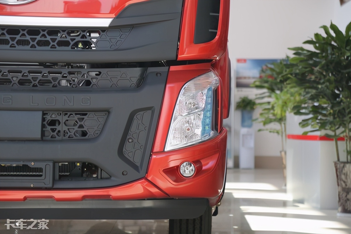 大灯也是乘龙H5的亮点之一,最上方为转向灯设计,中间和下方为卤素光源的远近光大灯,最外侧为LED的日间行车灯。蓝色的日间行车灯也是乘龙H系列的特色,最下方为圆型的小雾灯。