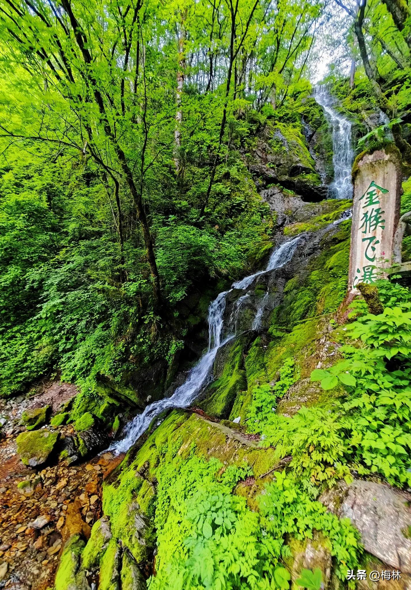 金猴龄有两个停车场,一个在山顶一个在半山腰,我们是从最上面的停车场进的,向上是原始森林,原始森林以巴山冷杉、红桦针阔混交林为主,向下是金猴飞瀑从半山腰出来,用时约1小时。