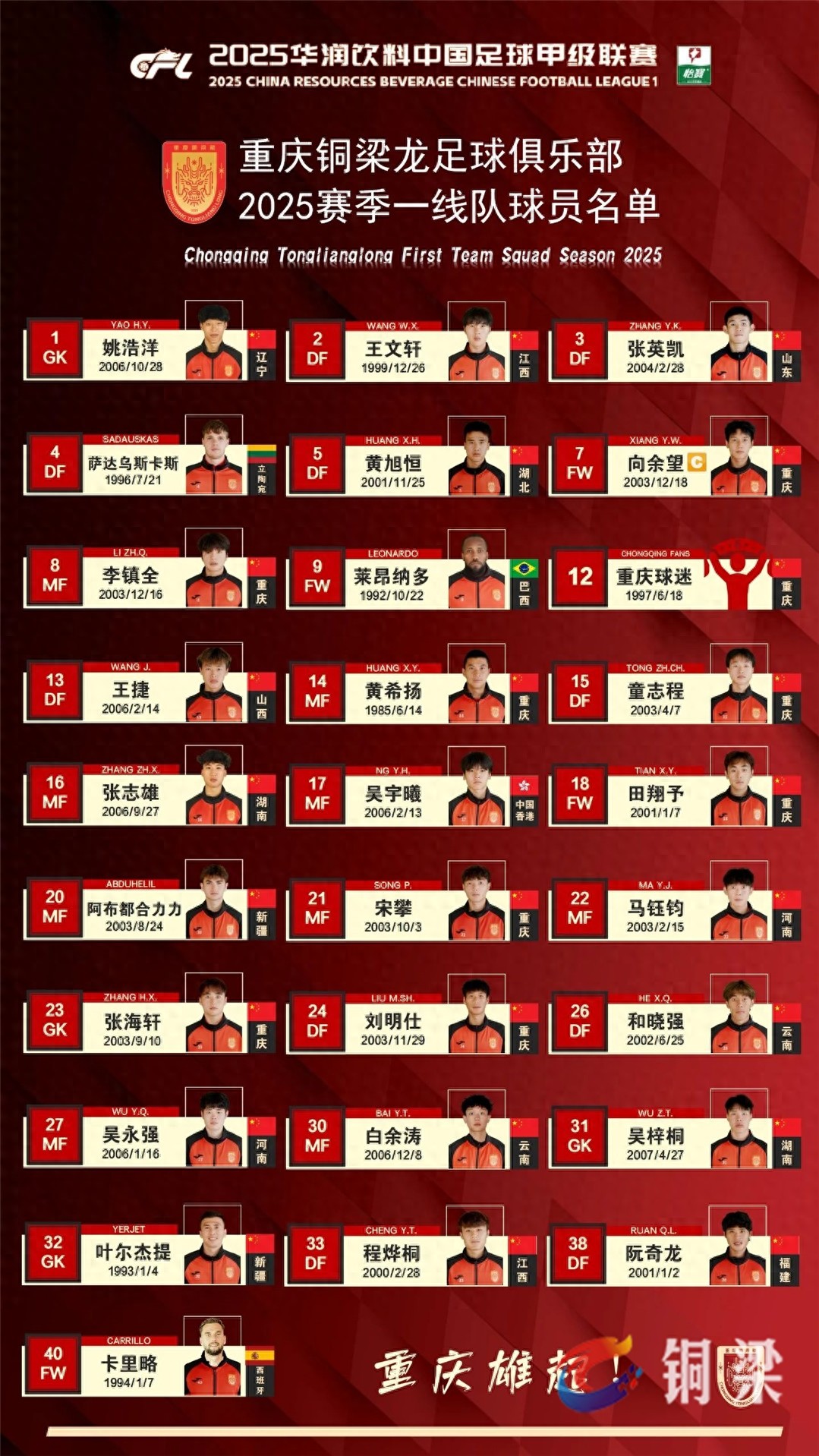 近日,重庆铜梁龙足球队2025赛季一线队名单正式发布,重庆本土球员数量为8人,占比29.6%,平均年龄23.7岁。