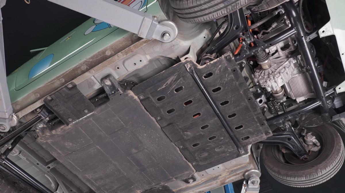 首先它底盘整体上,看上去还是比较平整的,两侧的边梁包住了中间的电池,从侧面看,也没有下凸的电池包,电机下方也有护板,还有打孔散热的处理,但是基本没有什么喷涂。这样的话底盘噪声肯定是少不了了。当然如果车辆的电泳做好了,没有喷涂也是不影响防锈的,这点不用担心,很多合资的油车,比如通用系,即便到了10多万甚至20万,也很少见喷涂。