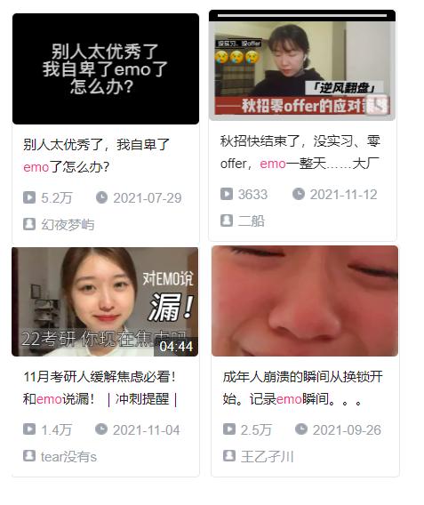 在年轻人最常驻足的B站中检索“emo”,各种各样的emo涌现,手机向下划了1分钟也没能见底。