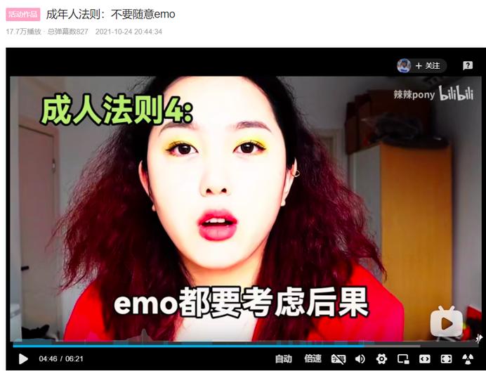 当然,emo并不是任性,也不是不顾一切地宣泄,譬如B站视频《成年人法则:不要随意emo》中提到“emo都要考虑后果”,emo之余仍不忘强调高压之下的情绪控制对于成年人的重要。