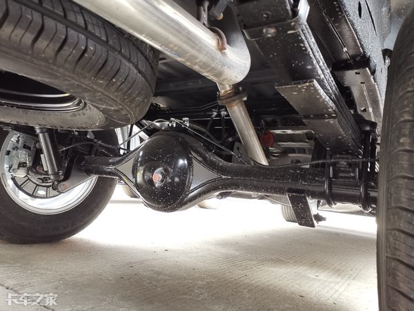 后桥采用钢板弹簧悬架,比较有特点的是后桥减震器在安装上并不是左右侧同方向,而是采用一前一后,这样减震器能够吸收更多来自不同方向的震动,提高一点行驶舒适性。