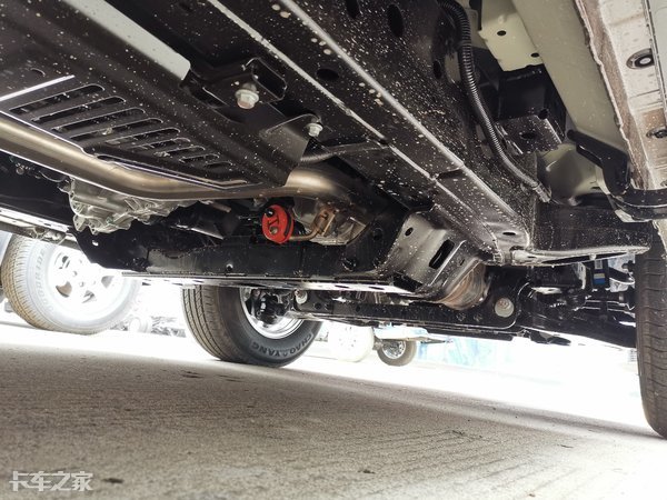 车架与前悬之间设计有支座,支座上安装有橡胶,毕竟车辆自重达到两吨,激烈操控时,悬架过度压缩必定会与车架发生硬性接触,损坏车架及悬架。尾气后处理系统也高于元宝梁,降低了磕碰几率。