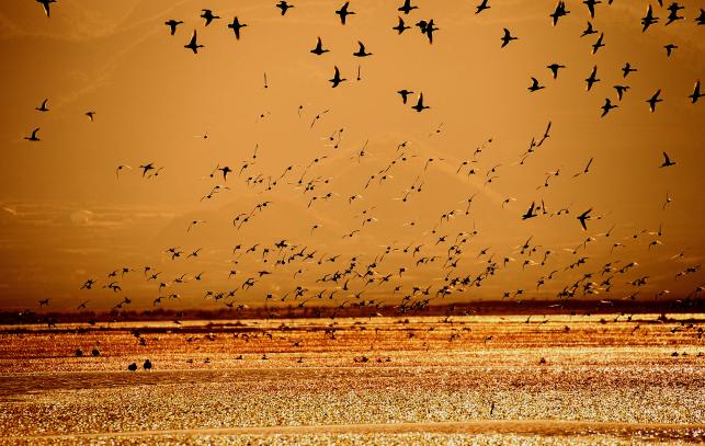 夕阳下,阳光洒满整个乐安湿地,鸟群在这里迁徙、繁衍,在金色的阳光下飞舞。 张东供图
