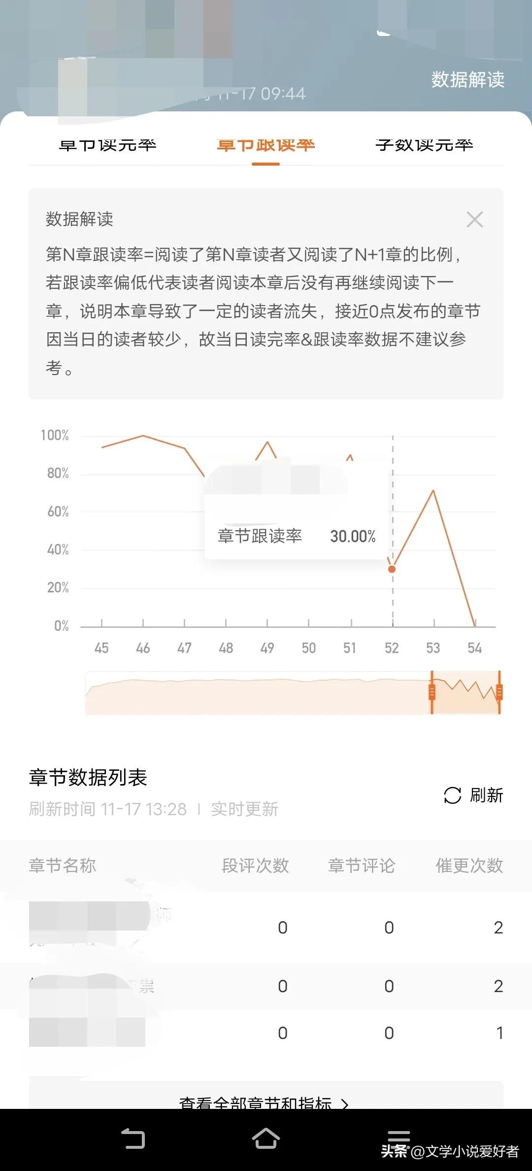 3.章节跟读率,自从验证期开始,每天两章的波动很大。