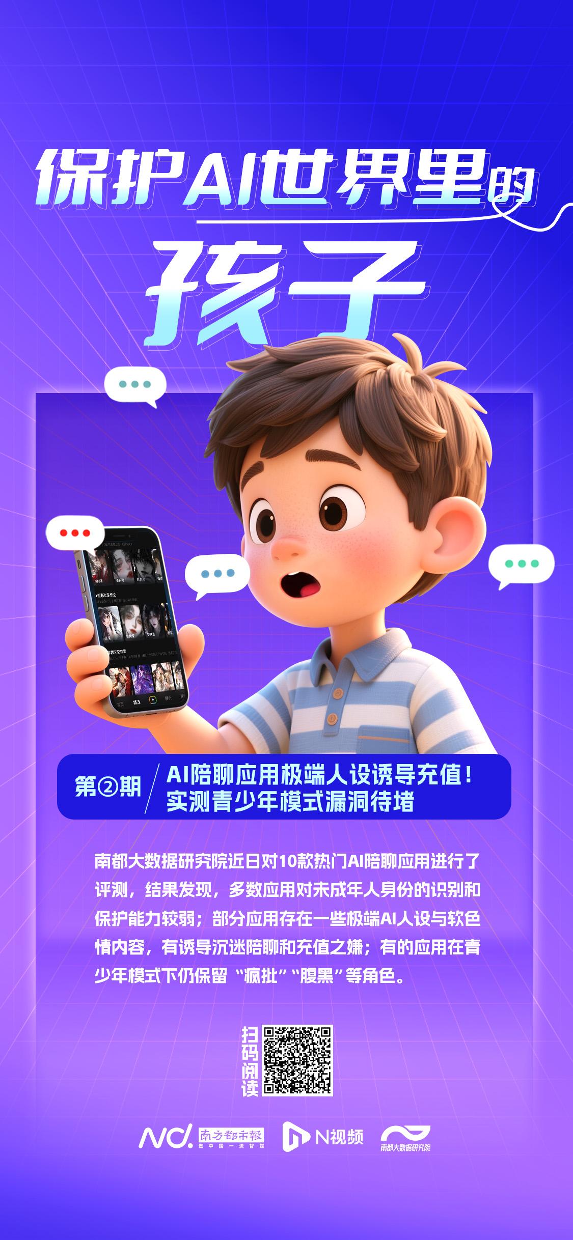 南方都市报、南都大数据研究院即日起推出“保护AI世界里的孩子”系列调查报道,聚焦部分AI应用隐藏的侵害未成年人权益的场景,关注背后数据污染、模型异化等深层风险,以期助力服务提供者筑牢安全底线和内容防线,护航未成年人健康成长。