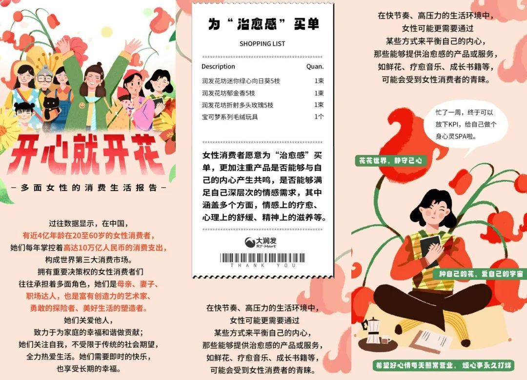 此外,大润发同步发布了《开心就开花——多面女性的消费生活报告》,结合社会洞察和相关消费数据,从女性在社会、家庭、职场等多个角色出发,以“品质”“个性”“清醒”“乐趣”“治愈”“同理心”“健康生活”等为关键词,阐释当代女性的生活消费状态。报告概述中写道,“开心就开花”是一种象征,代表着女性内心关于自我的表达,也阐释着内心的丰盈、喜悦与满足。