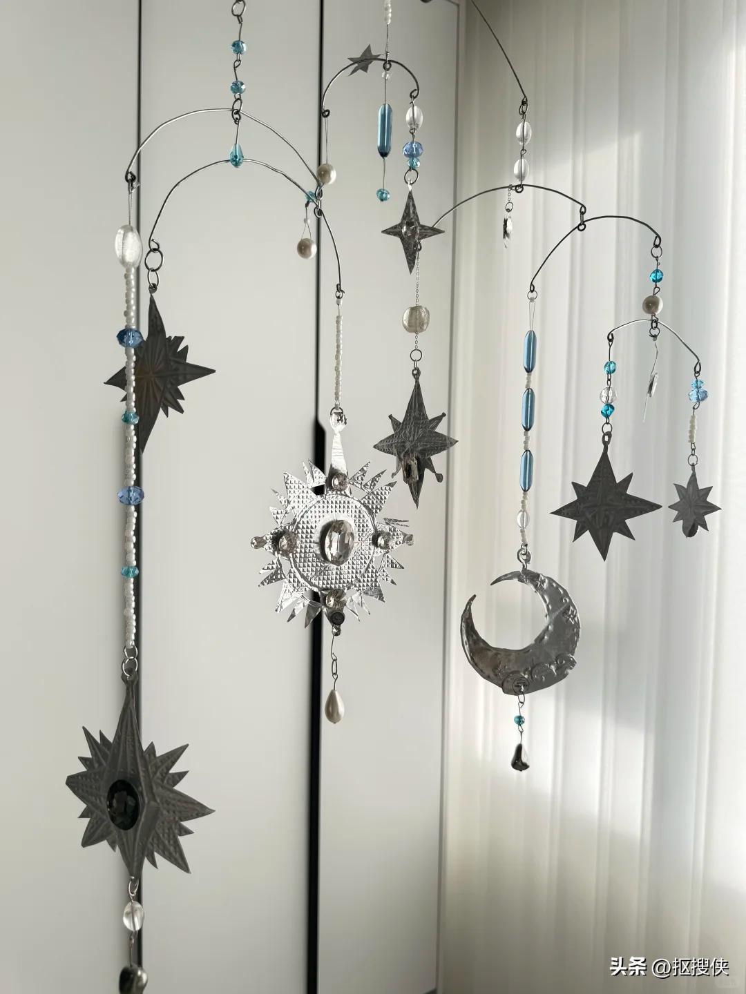 用铝箔纸制作成太阳月亮的造型,然后拴在吊饰上,在做装饰,课程中会使用到热熔胶粘贴,让其更加牢固,挂在家里满满的成就感。