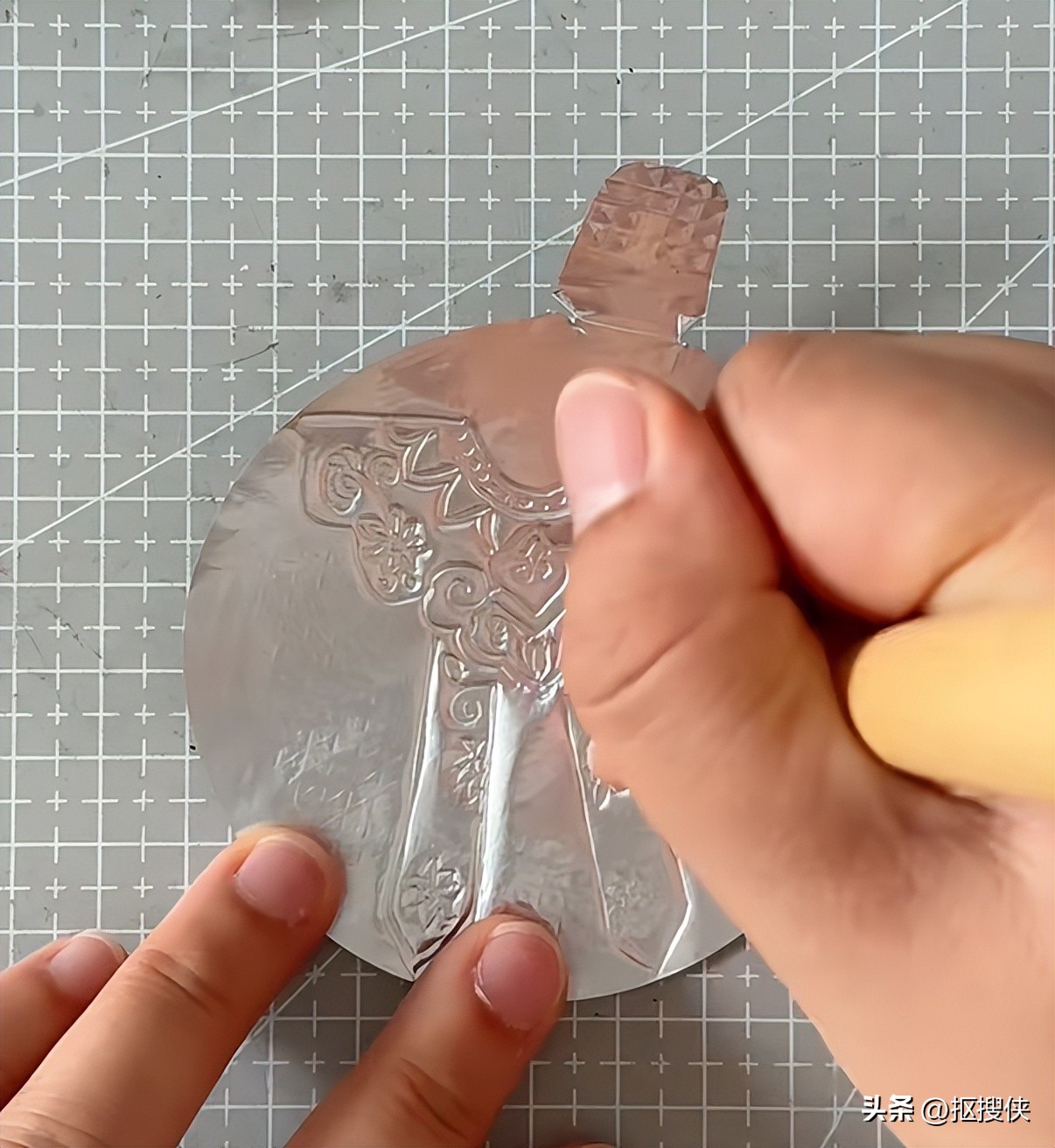 你还可以使用奶粉罐的铝箔纸制作仿银浮雕云肩冰箱贴,将铝箔纸抚平之后,准备开始画,