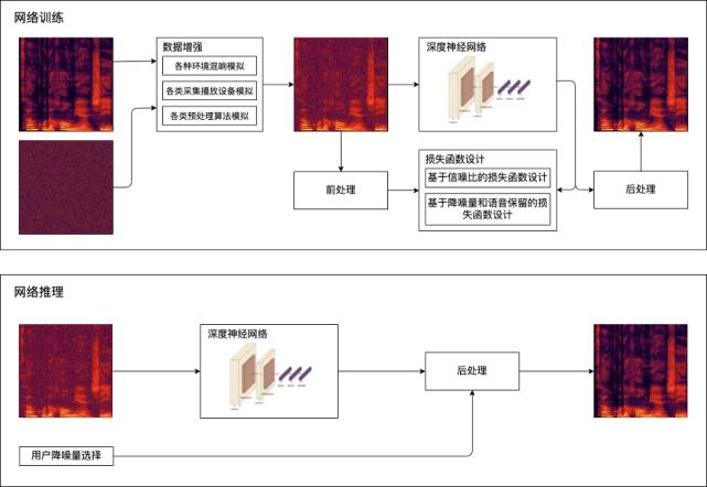 第三个方面是数据增强。噪声数据的多样性是提高降噪模型泛化性的关键。为此,技术团队进行了各种环境混响、采集播放设备、预处理算法的模拟,以此来产生各种数据。基于这些数据,技术人员再依靠 AI 算法训练神经网络去区分语音和噪声,从嘈杂环境中剥离出干净语音。