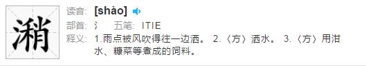 “潲”shao,指雨被风吹得往一边洒。如“雨潲进来了”。