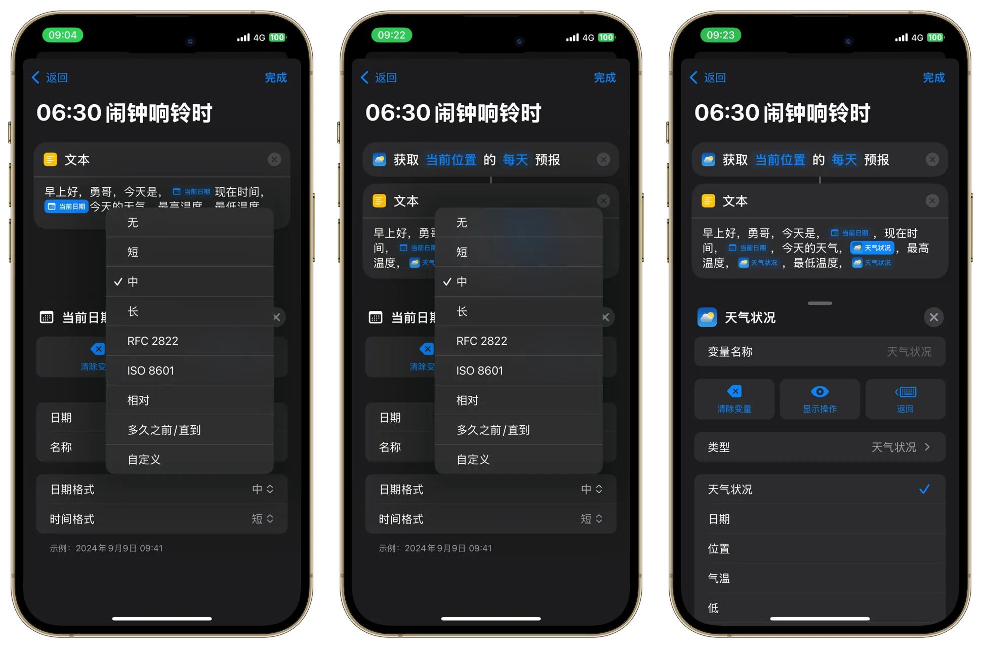 “当前日期”:设置项目里选择“日期”,“日期格式”选择自定义,我们这里仅需要播报当天日期和星期,不需要时间;“现在时间,”后面再添加一个“当前日期”,自定义格式只剩下小时和分钟。