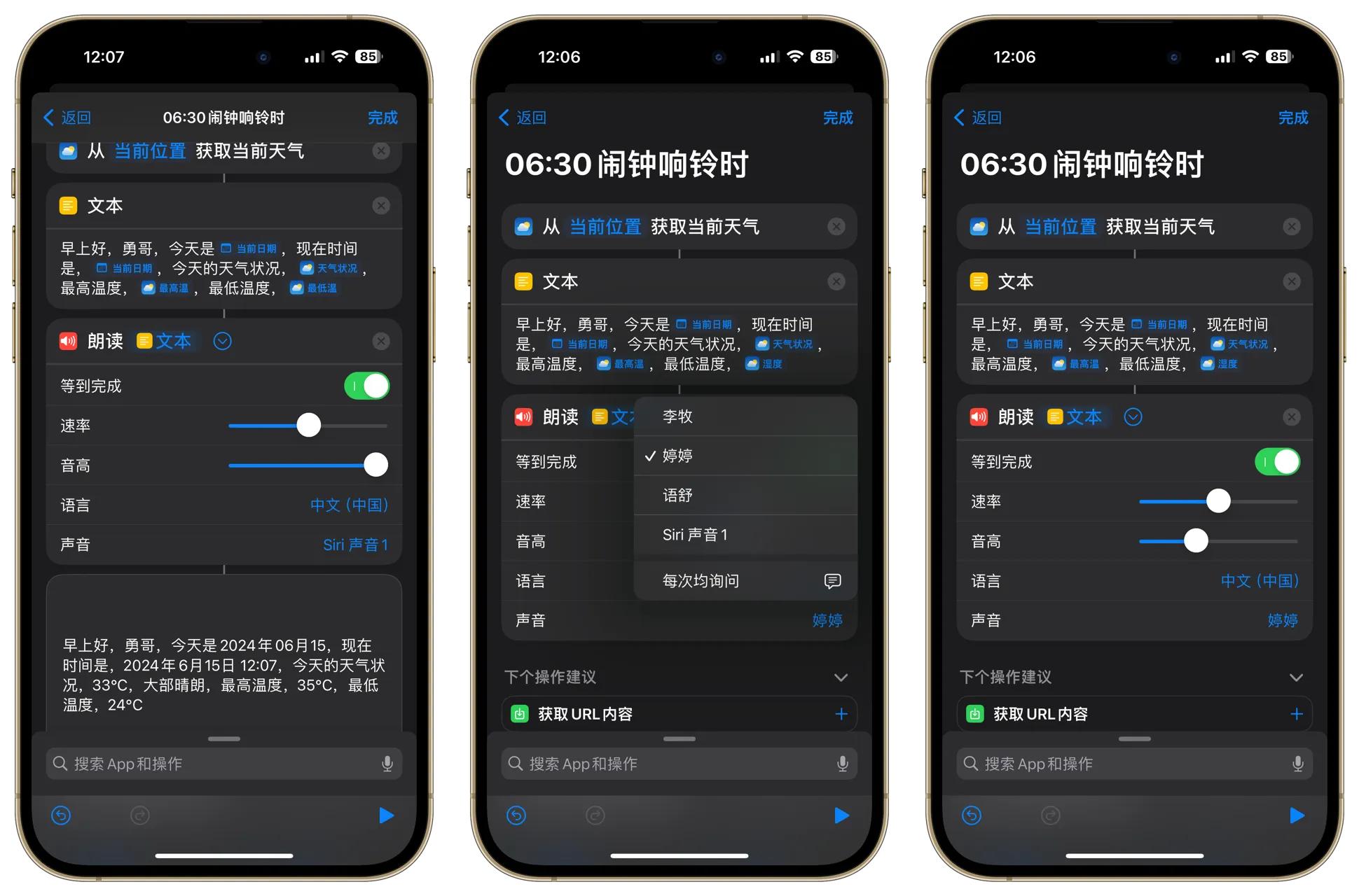 很多朋友就会说,伸手拿起手机翻开不就能了解上述信息了吗?那你就大意了,如果能让我们的iPhone每天在闹钟响起的时候,同时播报此刻的时间、当天的天气状况等信息,根本就不用伸手,岂不美滋滋?