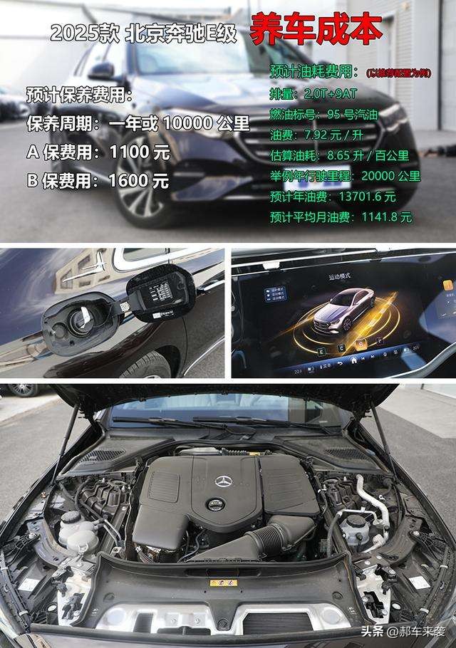 提到豪华品牌,相信不少朋友还会担心养车成本,下面郝哥就来为您算笔账,保养方面,2025款奔驰E级保养周期为一年或10000公里,A保费用1100元,B保费用1600元左右,这个价格也算是在意料之中的了。至于油耗,郝哥同样以推荐配置为例,新车工信部综合油耗显示为6.65升/百公里,为了更接近真实,郝哥以再增加两个油计算,也就是8.65升,目前北京地区95号汽油的油价为7.92元/升,假如每年行驶20000公里,那么预计您的年油费为13701.6元,平均月油费为1141.8元,不知道这样的油耗水平您还满意么?