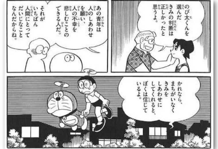 大雄不完美,不够能干,但他能感同身受他人的喜怒哀乐,能够为了静香全力以赴。这点是万能优等生出木杉君身上欠缺的。