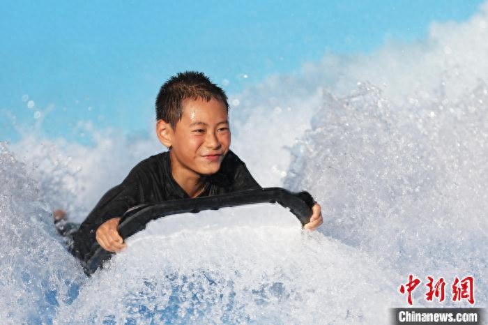 7月5日,上海玛雅海滩水公园迎来暑期客流高峰。连日的高温推动“清凉经济”升温,不少民众选择来到玛雅海滩水公园戏水消暑。图为小朋友在玩冲浪。中新社记者 汤彦俊 摄