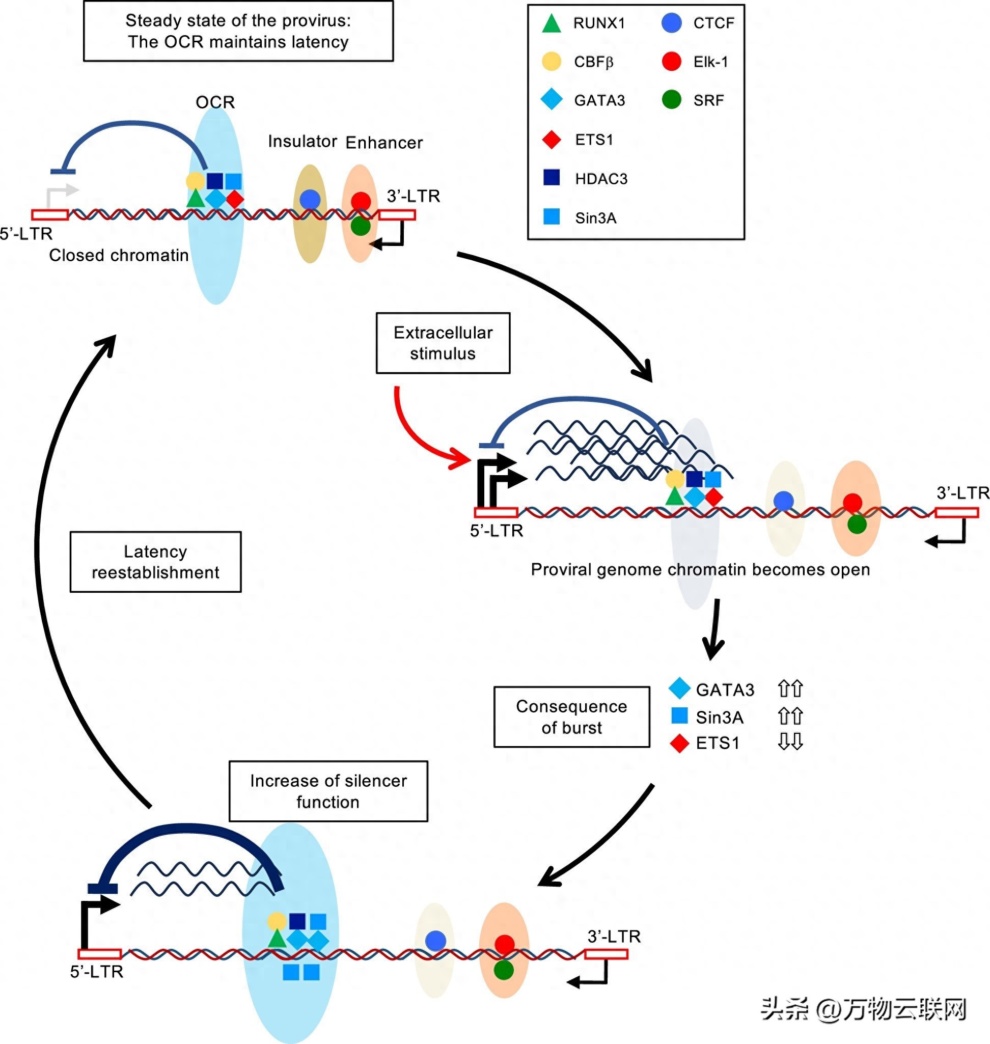 Satou团队通过最新的ATAC‑seq与ChIP‑seq技术,锁定HTLV‑1在感染者外周CD4⁺T细胞中的一个“开放染色质区域(OCR)”。这一区域事实上能绑定位宿主的转录因子RUNX1(以及GATA3/ETS1等辅助因子),使病毒5′ LTR启动子“关灯”式沉默,进入极低表达状态。 - 脱除沉默元件,立即“曝光”