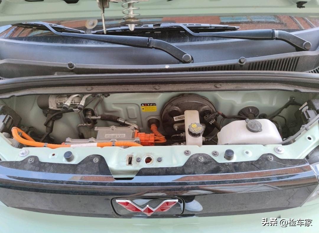 检查细节方面,可以看到水箱框架周边附件存在拆卸,框架本身也存在变形的情况;不过最让人意外的还得是前纵梁,变形开裂,直接可以定义为国标事故车,也就是常说的重大事故,马卡龙夹心款,真对得起这名字,我看这辆车肯定是被前后夹击过的。但看前后受损都这么严重,原车主居然没事儿,我对这辆车的安全性有了一个新的认识,谁说宏光MINI安全性差的?
